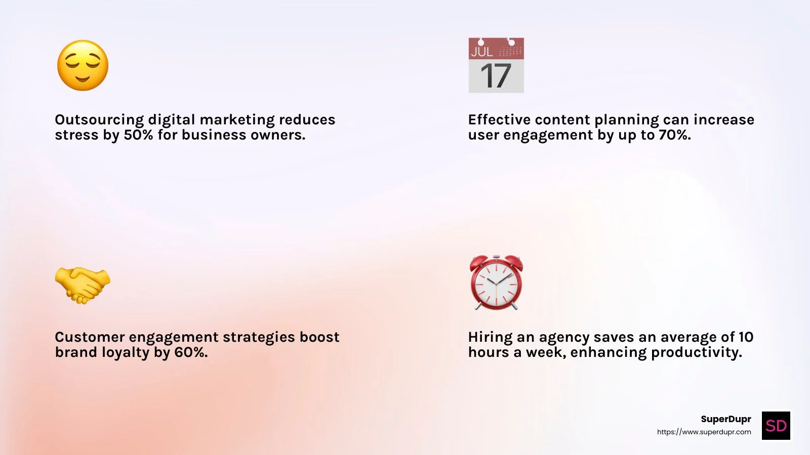 Hiring a digital marketing agency like SuperDupr offers numerous benefits that can transform your business operations and drive growth. Let's explore these advantages: