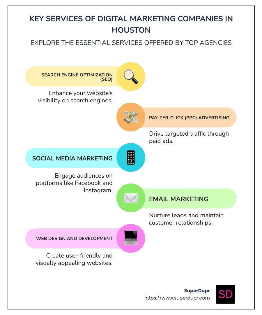 When it comes to digital marketing companies in Houston, understanding the key services they offer is crucial for business growth. SuperDupr, a leader in digital marketing with a strong presence in Houston, provides a comprehensive suite of services to help businesses thrive in the digital landscape.